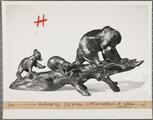 Photograph of a painting by Charles M. Russell which is of three Indians, one male tying wood on a burro while another watches and a female Indian is looking on from above. Charles M. Russell's signature is visible in the lower left corner of image and the back appears to have been brushed with glue.