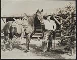 Photograph of painting by Charles M. Russell: 'Indians on Horseback' Pictured are 5 Indian horseback riders in the foreground and a couple of carts and riders in the background. Russell's signature is visible in the lower left corner of image along with the date of 1924 and on the back is a 'Keystone Photo Service' stamp.