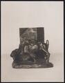 Photograph of a sculpture of an Indian head. Verso is a stamp that reads 'This is to certify that the subject herewith identified: Indian Head Original Model by C.M. Russell (information handwritten) was an asset of the Estate of Nancy C. Russell, deceased. June 1941 (illegible signature) as executor of the above estate.'