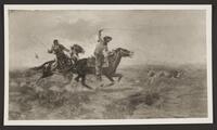 Photograph of a painting of two mounted cowboys trying to rope a wolf.