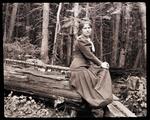 Photograph of wood carving by N. Fechin titled, 'Indian Dancer.' Side view. White paint is around the dancer on the front side of the photograph, and glue residue covers the back. Label on back states, "Indian Daner, Wood carving by N. Fechin from Britzman collection."