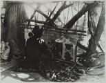 Two men on horses have roped a cow, while other men hold it down and brand it on the prairie.