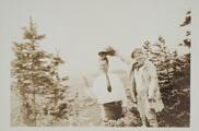Group of men and horses near a camp with tents. Bluffs in the background.