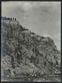 Photograph of a parade of coaches and people on horseback down a small town street. Street lined with spectators. Embossed bottom right and stamped on back.