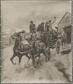 Negative and copy of a negative of a large group of Indian men in traditional dress and men dressed as cowboys on the prairie.