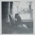 Black and white photograph of a man dressed up with make-up, seated in a chair next to a bed. Similar to the same man in TU2009.39.7649.61. Identified as 'Ted all Dolled up.'