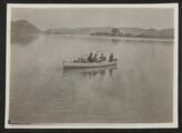 Black and white photograph of three women in a boat. They are likely in Lake MacDonald, Montana.
