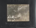 Black and white photograph of four people in a canoe on a lake. They are likly in Lake Mcdonald, Montana.