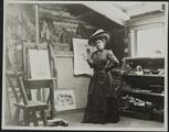 Black and white photograph of a model sailing ship on a lake. Likely Lake McDonald.