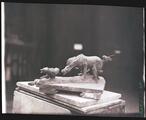 Black and white photograph of a model sailing ship on a lake. Likely Lake McDonald.