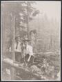 Black and white photograph of five buffalo on plains. Buffalo appear to be consuming grass. Wooded area appears in background of image.