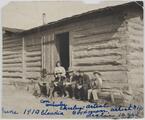 Charles M. Russell and Friends Seated Next to Log Cabin