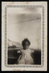 Unidentified woman in a white dress wearing a large black and white feather hat |