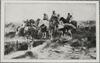 Photograph of two men sawing a log with a large hand-saw in the forest |